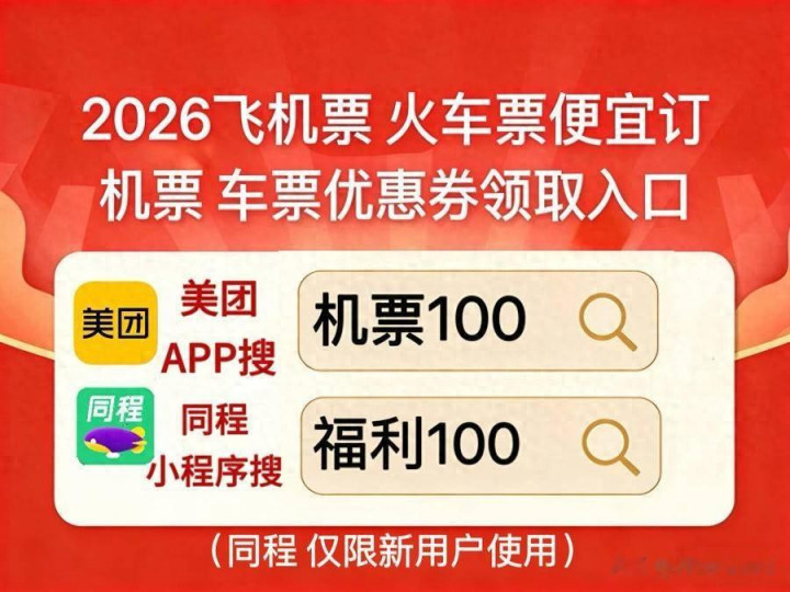 好意思团APP搜【机票100】同程搜【福利100】廉价订机票攻略。2026机票高铁购票攻略:哪个APP订机票低廉?出行机票如何订低廉?特价机票如何订?径直去好意思团APP搜【机票100】同程搜【福利100】领特惠券包,低廉订机票车票啦!