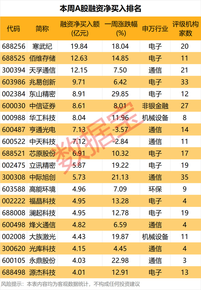 个股方面,本周28股获融资净买入额在3亿元以上。寒武纪、佰维存储、天孚通讯、兆易革命、东山精密净买入额排行前五,挨次为19.84亿元、12.63亿元、12.15亿元、9.71亿元、8.91亿元。前五名中的寒武纪、佰维存储、兆易革命均为半导体芯片股,相似上榜的还有芯原股份、澜起科技、源杰科技等。
