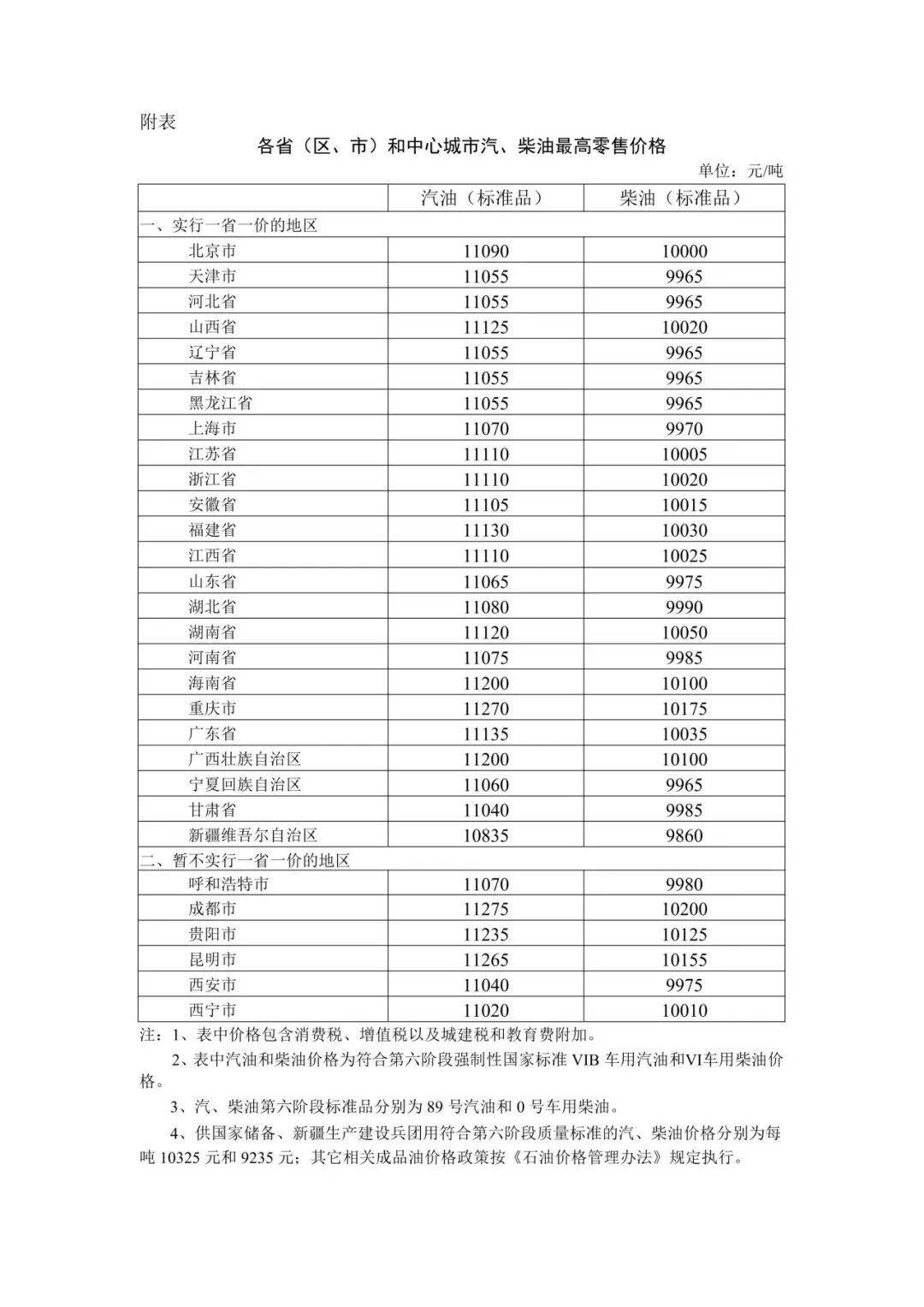附:各省(区、市)和中心城市汽、柴油最高零卖价钱