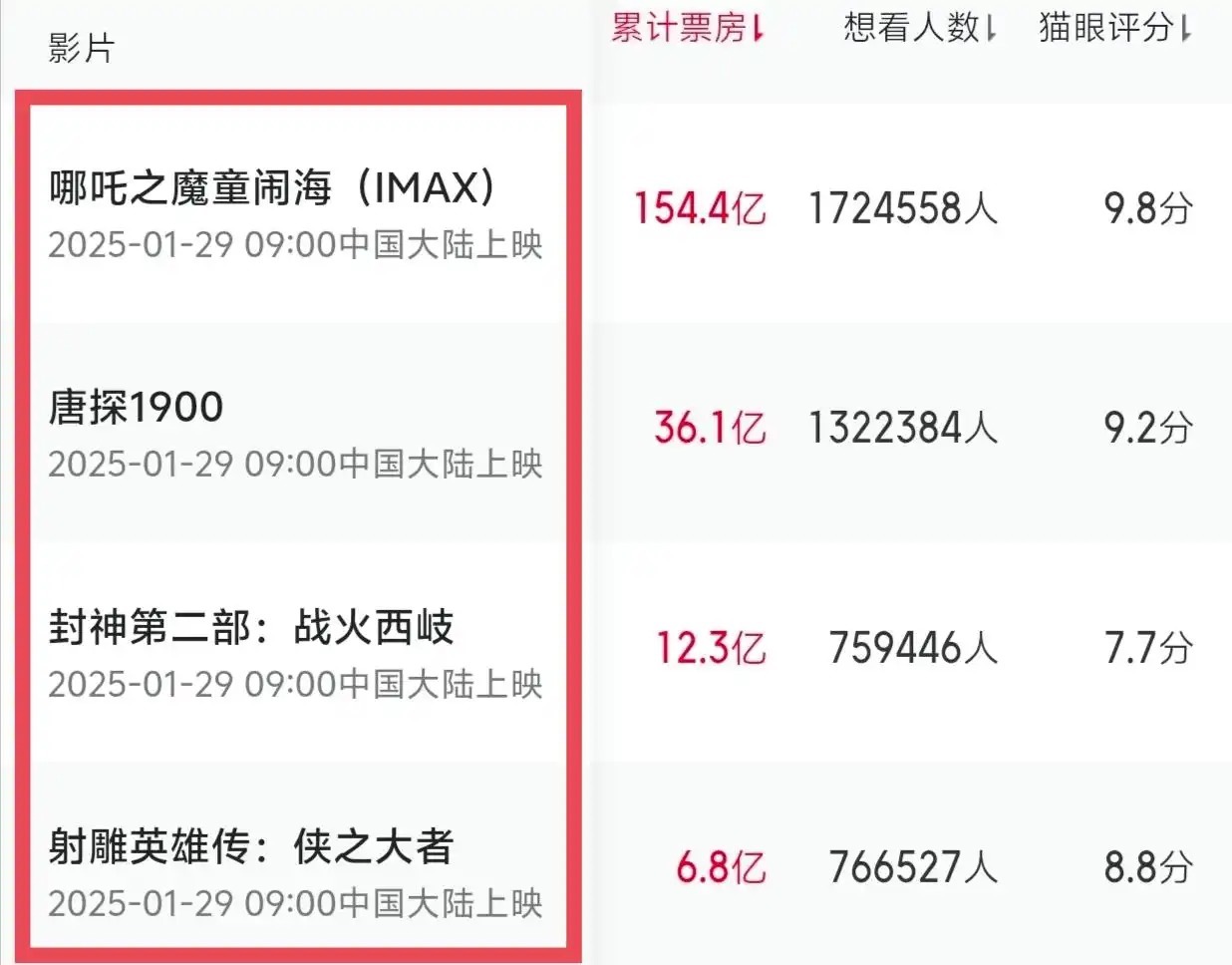 把跟它一皆开映的由大导演捏导的大制作《封神第二部》《射雕硬汉传》《唐探1900》全部都打爆了。