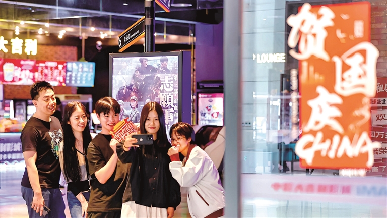 在天津市滨海新区一影城,不雅众与电影海报合影。新华社发
