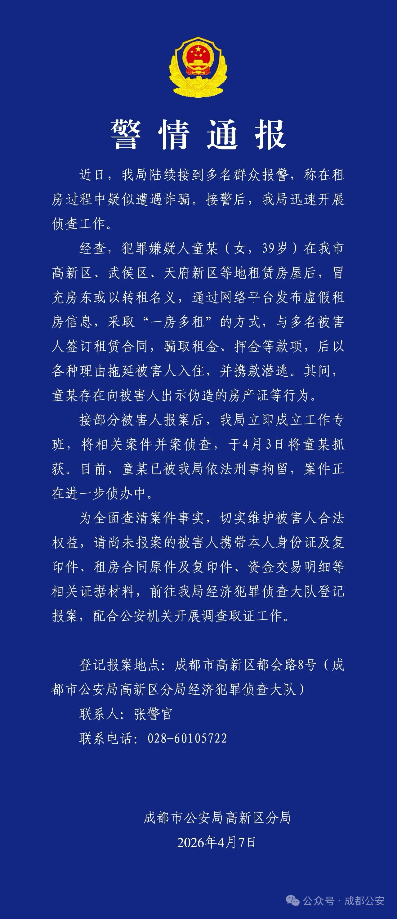 4月7日,成皆市公安局高新公老实局发布警情通报称,近日,警方继续接到多名人人报警,称在租房经由中疑似际遇欺诈。接警后,警方马上开展捕快职责。