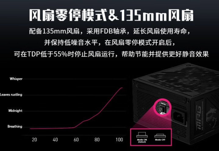 微星MPG A1000GS PCIE5在散热上遴荐135mm FDB液态轴承电扇,支柱智能启停,低负载下电扇停转收场零杂音,高负载时高效散热,获Cybenetics A级杂音认证。安全方面掩盖OCP/OTP/OPP/SCP/OVP/UVP等全维度保护,阻绝过压、过流、过炎风险。整机提供10年质保,是高端平台恒久褂讪驱动的可靠能源基石。