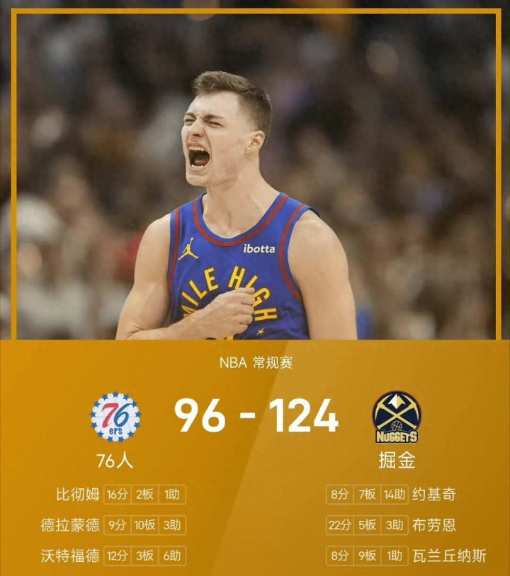 北京技术3月18日,NBA成例赛掘金主场对阵76东谈主,掘金在约基奇全面进展引颈下,用团队攻势压制残阵76东谈主迟缓扩大30+上风提前锁定胜局,最终掘金124-96赛季双杀76东谈主,掘金反超丛林狼升西部第五,76东谈主限制2连胜。