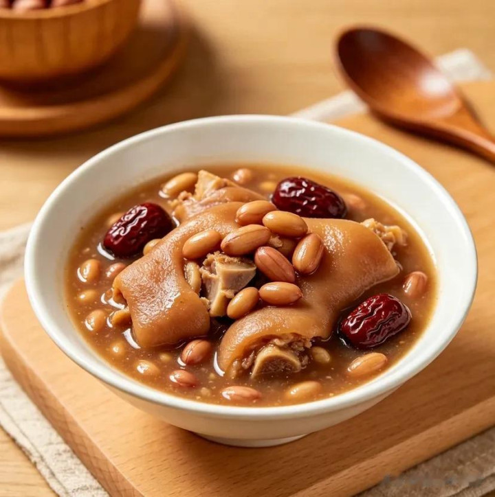 食材:猪蹄1只、红衣花生50克、红枣6颗、盐、姜片