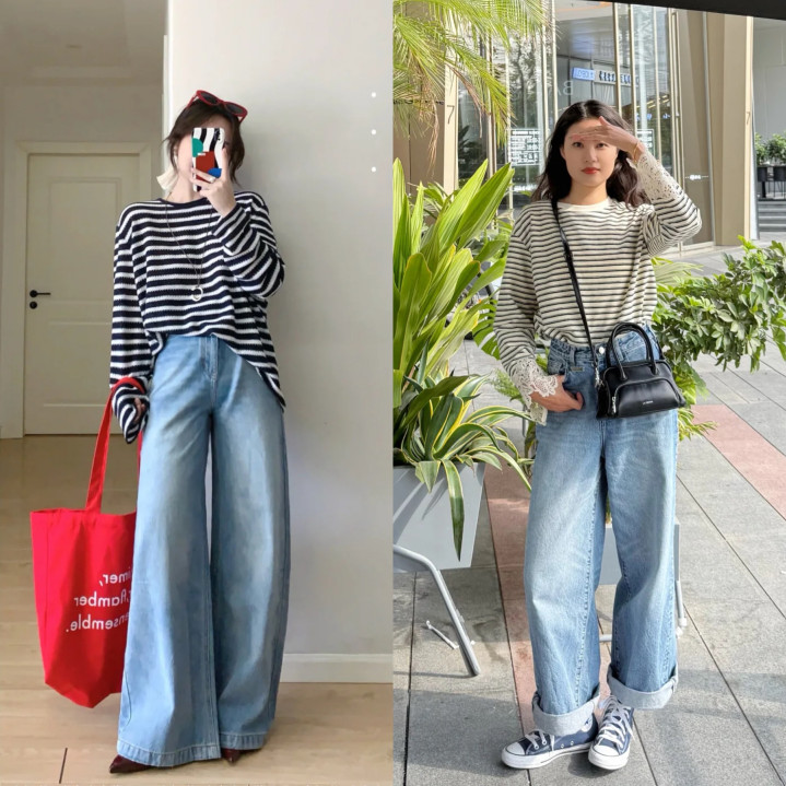 看成外搭,条纹衫都备是春季穿搭的最好,选择宽松的版型,搭配高腰牛仔阔腿裤,将下摆豪恣塞进裤腰,收缩打造慵懒舒坦又遮肉显瘦的造型,微胖体魄也能收缩独霸,氛围感十足。