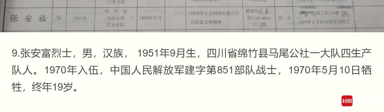 4月7日,封面新闻记者来到绵竹市退役军东谈主事务局,一册自由的《四川省绵竹县改进义士英名录》名册被轻轻绽放。第19页明晰地记载着:张安福,1951年生,绵竹县马尾公社东林大队东谈主,1970年1月参军,同庚5月18日在渡口市国防施工中糟跶,1970年5月23日被批准为义士。