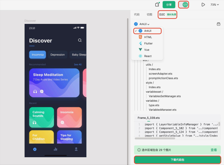 第二步过问研发模式,选拔D2C功能并指定鸿蒙ArkUI当作办法讲话。系统会自动分解页面结构,及时生成代码预览。设立东说念主员不错在右侧看到组件层级结构与代码对应关连,阐明无误后再进行下一步。