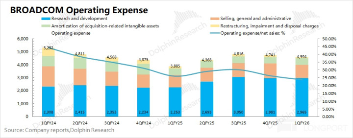 博通 BROADCOM (AVGO.O) 在 2026 财年第一季度的缠绵用度为 46 亿好意思元,环比略有回落。
