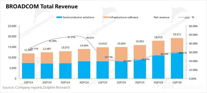 博通 BROADCOM (AVGO.O) 在 2026 财年第一季度兑现营收 193 亿好意思元,同比增长 29.5%,合乎市集预期(192 亿好意思元)。同比增长主要来自于 AI 业务增长的带动。