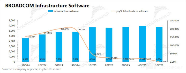博通 BROADCOM (AVGO.O) 在 2026 财年第一季度的基础递次软件兑现营收 68 亿好意思元,同比增长 1.4%。此前 VMware 并购整合的影响依然被消化,之后主要良善于业务内生增长发扬。