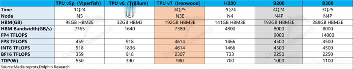 现时 TPUv7 依然开启量产出货,对比英伟达的 GPU 来看,TPUv7 在 FP8 等边界的发扬能够依然接近于英伟达的 B200(2024 年四季度量产),谷歌 TPU 能够过时于英伟达一年傍边。