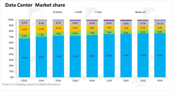 b)AI 芯片份额:在 AI 芯片市集中,英伟达仍处于系数开头的位置,博通 AVGO 饰演者 “追逐者” 的脚色。