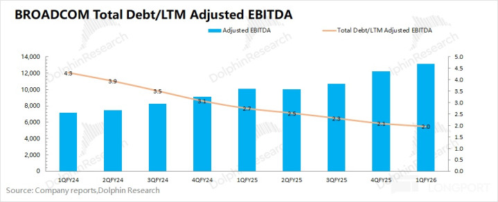 由于博通擅长外延并购,公司频繁把更正后 EBITDA% 算作公司的缠绵面缠绵之一。而海豚君测算公司 2026 财年第一季度的更正后 EBITDA% 回升至 68%,公司此前提醒(67%)。