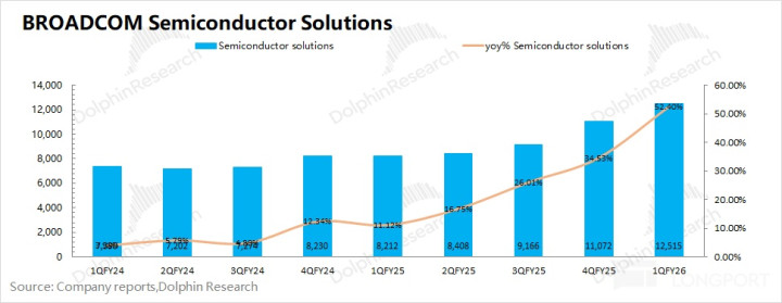 博通 BROADCOM (AVGO.O) 在 2026 财年第一季度的半导体贬责决策兑现营收 125 亿好意思元,同比增长 52%。公司半导体业务本季度的增长主要来自于 AI 业务的带动,非 AI 业务保抓稳重。
