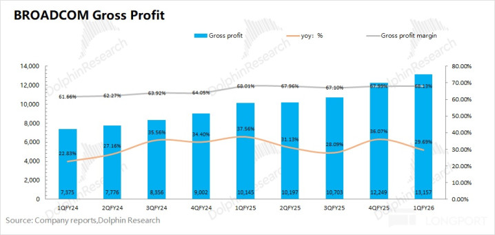 博通 BROADCOM (AVGO.O) 在 2026 财年第一季度兑现毛利 132 亿好意思元,同比增长 30%。其中博通在本季度的毛利率为 68.1%,环比略有提高。