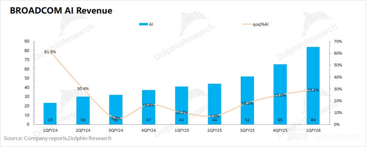 现时 AI 业务是公司的功绩重点,公司本季度的 AI 收入 84 亿好意思元,环比增长为 19 亿好意思元,环增再次提速,主要受益于谷歌 TPU 的出货带动。