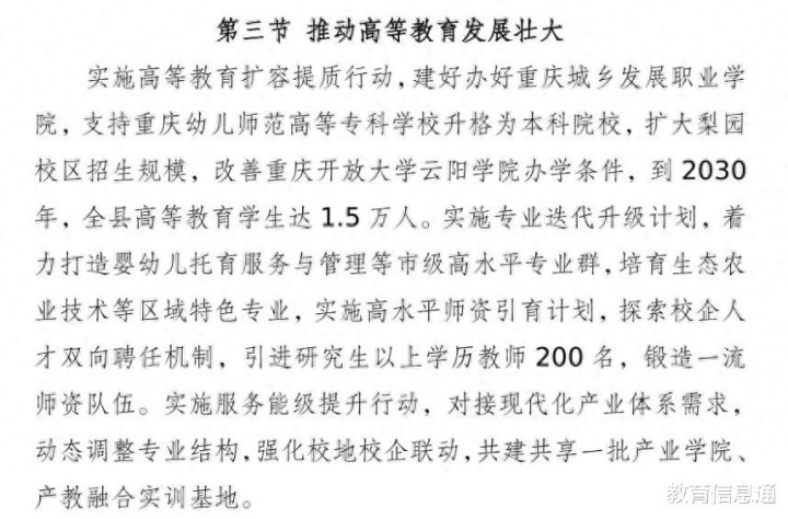 《云阳县国民经济和社会发展第十五个五年琢磨纲领》明确冷落“执行高级解释扩容提质行为,建好办好重庆城乡发展处事学院,支抓重庆幼儿师范高级专科学校升格为本科院校,扩大戏班校区招生范畴,改善重庆开放大学云阳学院办学条目,到2030年,全县高级解释学生达1.5万东说念主。”