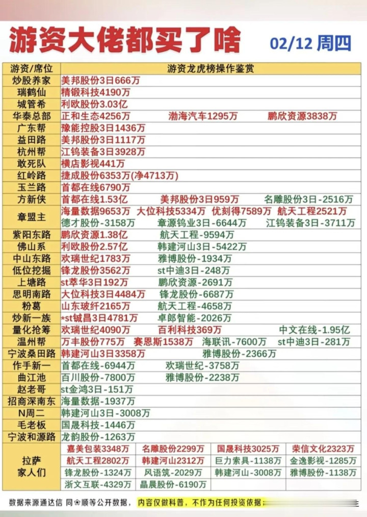 今天这篇著作,我把2月12日游资龙虎榜的所特等据、大佬操作、资金逻辑、板块契机全部拆解彻底,不藏私、不夸大,用最真实的数据带你看懂主力资金的真实意图,节前临了阶段不踩坑、不踏空!