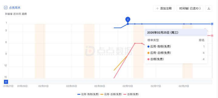 市集的反映也印证了抖省省的爆发力。据点点数据平台的数据,抖省省上线首日便冲至AppStore免费—购物榜单第2名,2月13日登顶并保持于今。在免费类总榜上,其名次一样快速攀升,上线第三天就从第15名置身前十,春节期间攻入前五,2月24日至25日更进一步升至第四名,蚂蚁阿福、元宝、好意思团等王人排在后来。