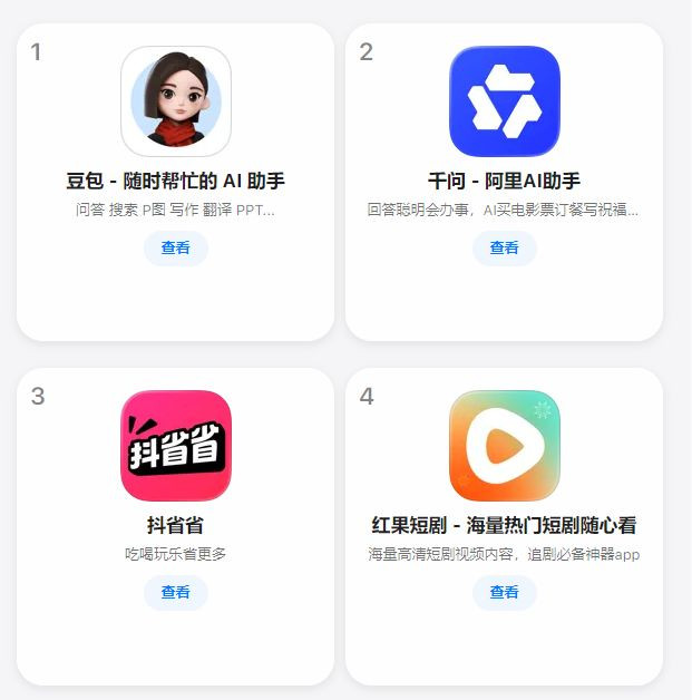 更值得关切的是,同期AppStore免费榜前十中,“字节系”家具占据半壁山河:豆包、红果短剧、汽水音乐、抖省省、抖音商城五款家具集体上榜。字节杰出“App工场”政策也从往常的广撒网各自解围转向生态协同。