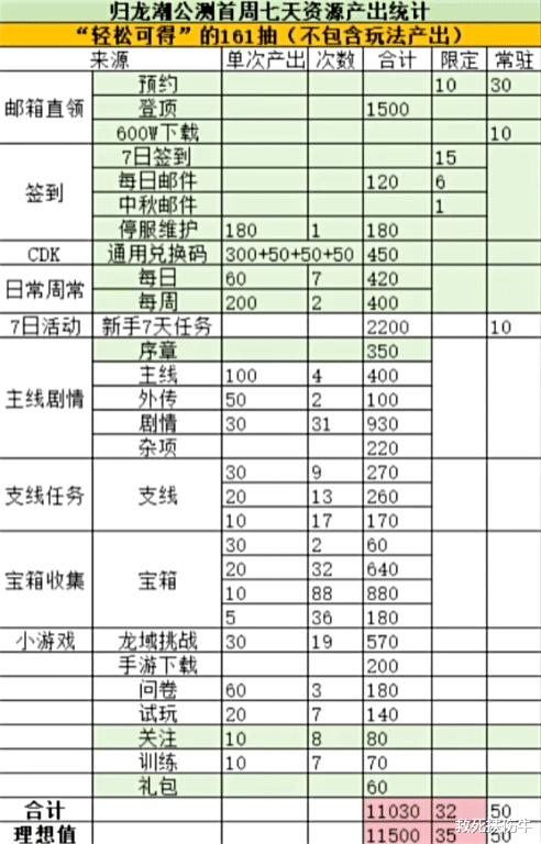 CDK、闲居、周常、7日行径、干线剧情、支线任务、宝箱会聚、小游戏沿途加进去齐够不上归龙潮官方宣传的141抽数,内部一些资源获取,甚而要肝上十几小时,也算不上“放肆取得”,是以统计资源的玩家就有一种“放肆可得”和“做事所得”的分类。